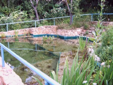 Es ist geschafft: seit Mitte Mai 2004 ist der Teich mit Wasser gefüllt. Neben der Bepflanzung mit verschiedensten Wasserpflanzen wurden auch Wasserschnecken eingesetzt, die die Scheiben sauber halten sollen. Zu meinem Geburtstag bekam ich fünf Teichmuscheln geschenkt, die das Wasser permanent filtern. Wie üblich gab es anfangs eine starke Algenentwicklung, die die Sichttiefe auf wenige Zentimeter reduzierte. Zusätzlich kamen aus der Zisterne, aus der wir den Teich mit Wasser speisen, feinste tonige Schwebstoffe, die bis heute zu einer feinen Trübung des Wassers führten. |